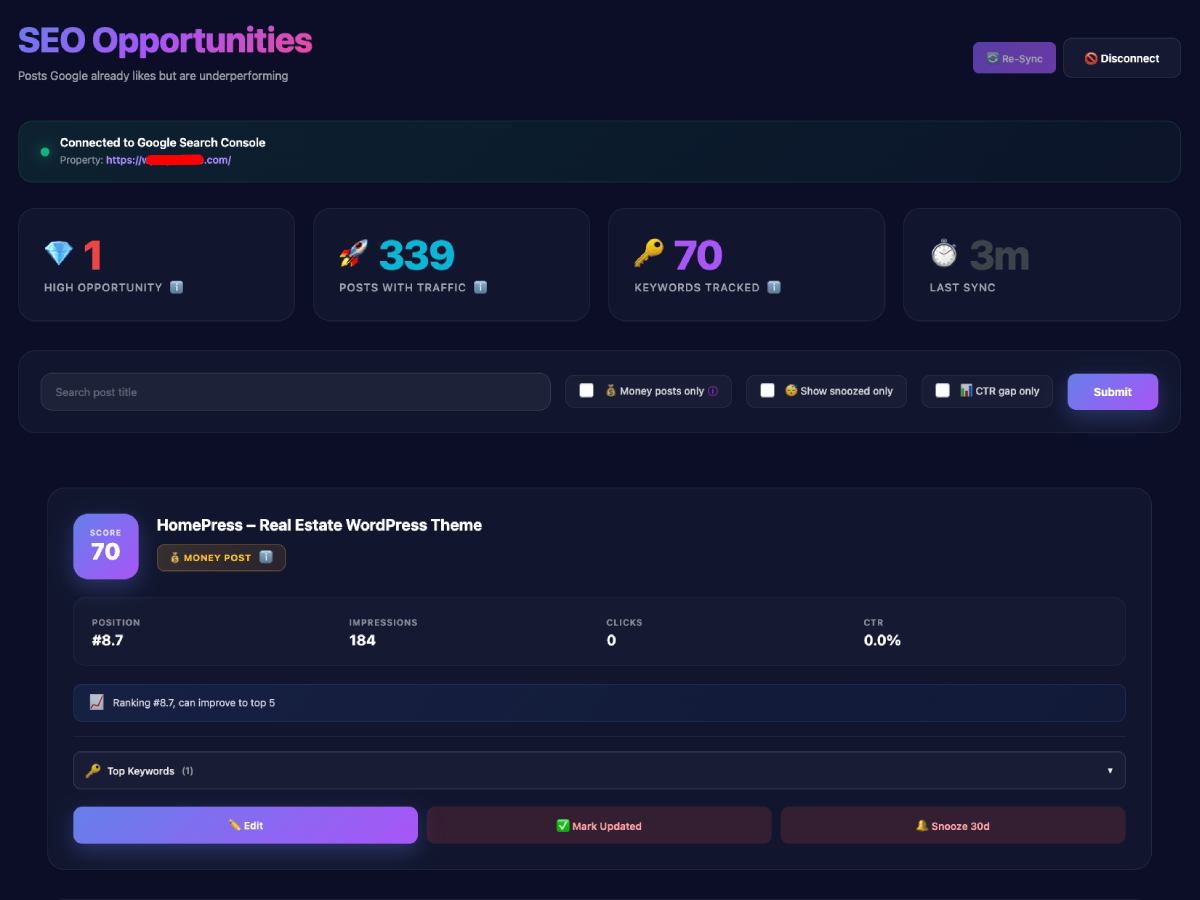 - Smart SEO Opportunity Detection (powered by Google Search Console) – Automatically identifies posts with SEO improvement potential