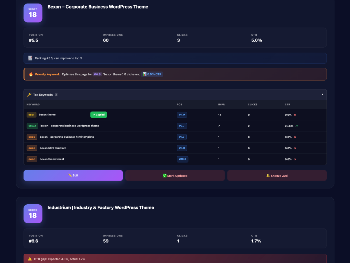Yes! Version 1.1 added keyword-level insights. For each post, you’ll see the top 5 keywords driving traffic, their positions, impressions, clicks, and CTR. The plugin even highlights your “priority keyword” – the one with the best optimization potential.